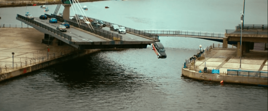 Our favourite stunt in the film, shot again in autumn 2014, shows a Hackney cab hurtling off Newham’s Connaught Bridge and into the river, while the bridge is opening to let ships through beneath. It took significant negotiations across many authorities and resident groups to clear the way for this.